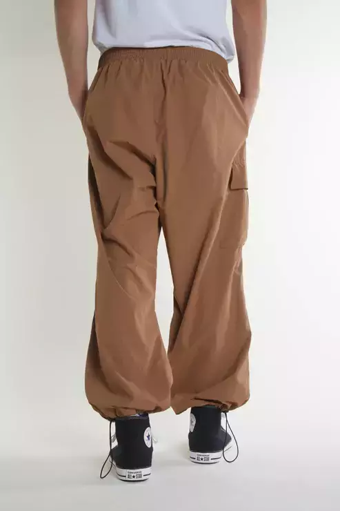 Pantalón de taslon rugoso con bolsillos frontales. Calce holgado. Cintura con elástico, tancas en cintura y ruedo para ajustar. Pinzas en las rodillas y bolsillo en lateral con etiqueta tejida de marca aplicada en solapa de bolsillo.